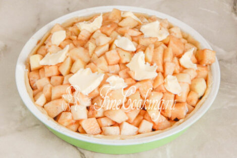 Викладаємо поверх тесту яблучну начинку (разом із сиропом, який уже утворився від цукру та соку). Руками акуратно надаємо начинці куполоподібну форму, щоб готовий пиріг не вийшов із кратером у центрі.