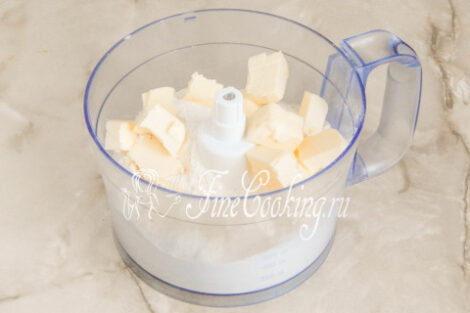 Потім кладемо холодне вершкове масло, яке нарізаємо меншими шматочками або натираємо на великій тертці (у разі ручного замісу тіста). Можна заздалегідь покласти олію в морозилку на кілька годин.