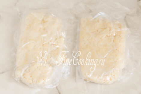 Ділимо тісто на дві рівні частини і кожну кладемо в пакет або загортаємо в харчову плівку. Відправляємо тісто в холодильник на 30 хвилин або в морозилку на 10-15 хвилин. Відразу вмикаємо грітися духовку на 220 градусів.