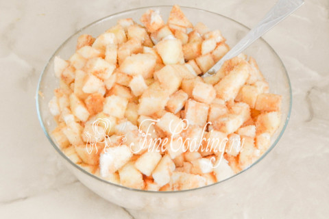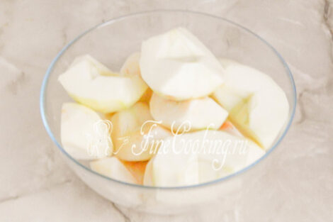 Нарізаємо яблучну м'якоть не дуже дрібними шматочками (стороною приблизно 2х2 см). Деякі кулінари воліють подрібнювати яблука довгими або плоскими скибочками, але я люблю саме квадратні шматочки. Збризкуємо фрукти лимонним соком і все перемішуємо.