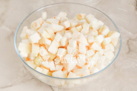 Тим часом чистимо яблука: знімаємо з них шкірку, вирізаємо насіннєві коробочки. 1 кілограм, вказаний в інгредієнтах – це вже в очищеному вигляді.