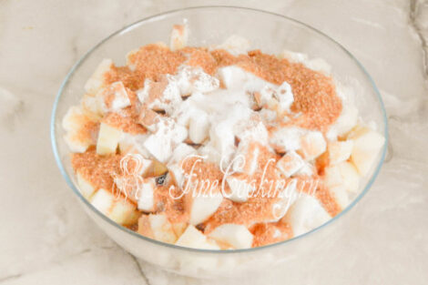 Додаємо 100 г цукрового піску і 80 г тростинного цукру, чайну ложку кориці і 3 столові ложки кукурудзяного крохмалю.