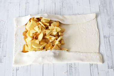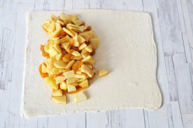 • Розподіліть яблучну начинку збоку, залишивши вільними краї. Дивіться як саме на фото.