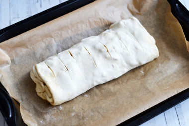 • Перекладіть рулет на застелений пергаментом лист швом вниз. Ножем зробіть на поверхні поперечні розрізи.
