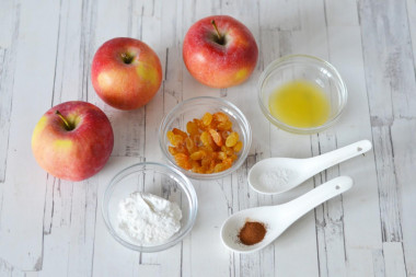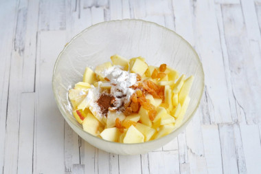 • У мисці з'єднайте яблучні часточки, підсушені родзинки, крохмаль, мелену корицю. Влийте лимонний сік.