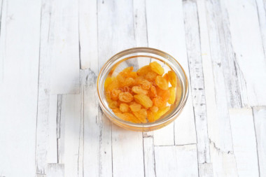 • Родзинки переберіть, видаліть сміття, перекладіть його в миску і залийте окропом. Залиште родзинки набухати на 7 хвилин. Через цей час воду злийте, родзинки обсушіть.